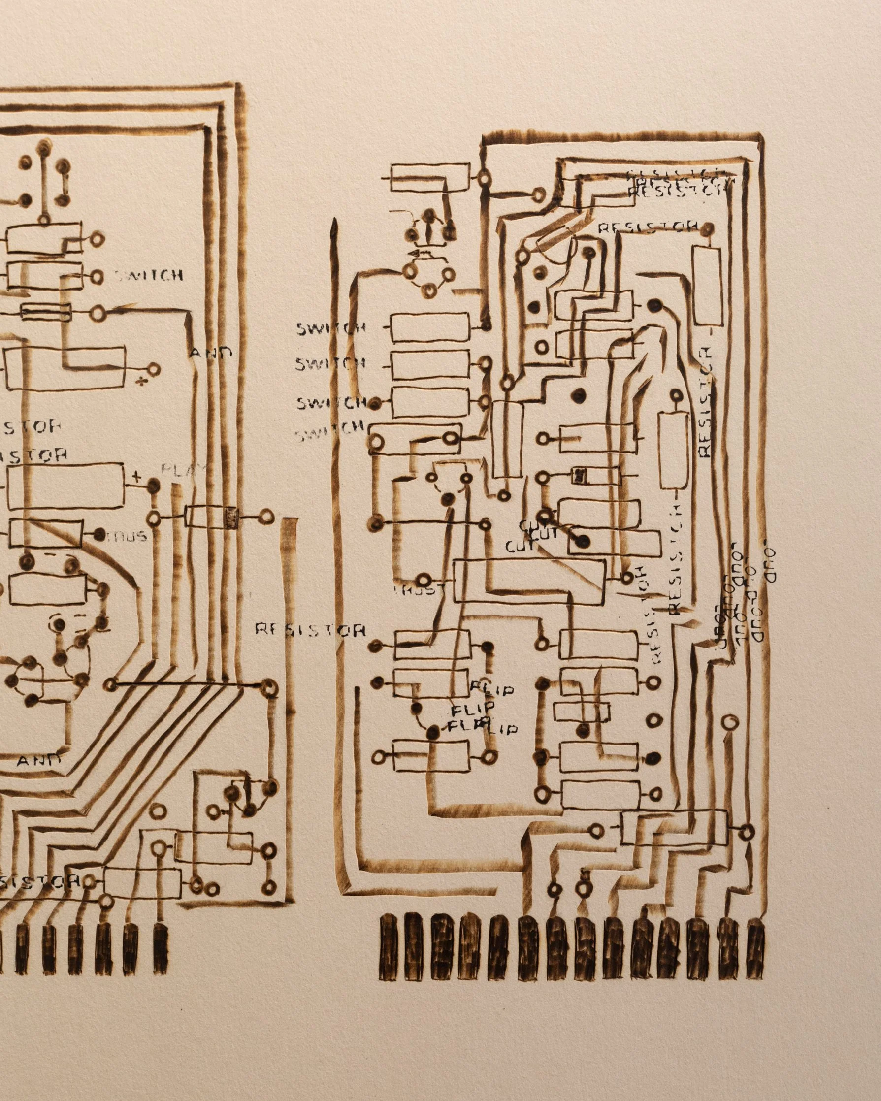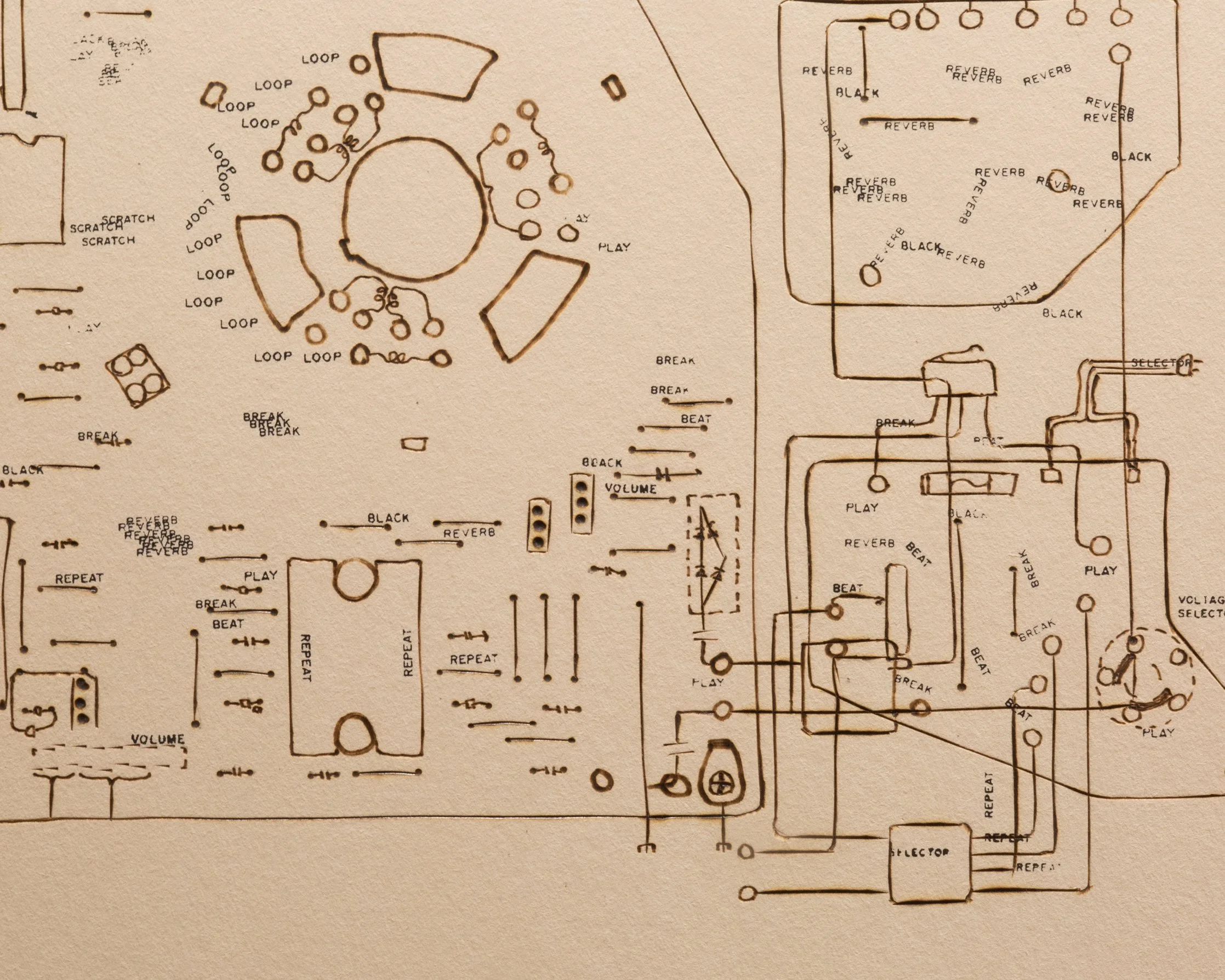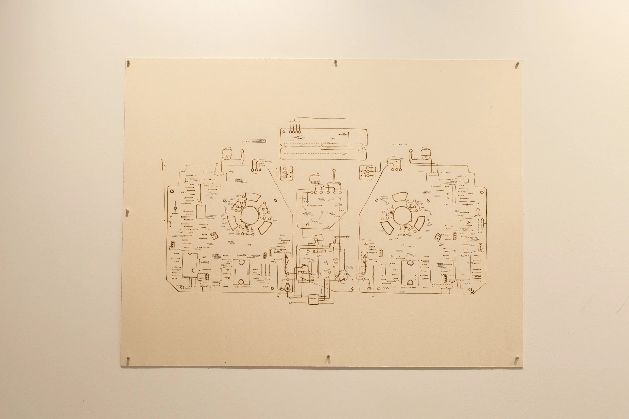 DJ Kool Herc’s Technics SL-1100 Turntables | 35.5” x 28” - ink, taskboard, graphite, soldering iron heat