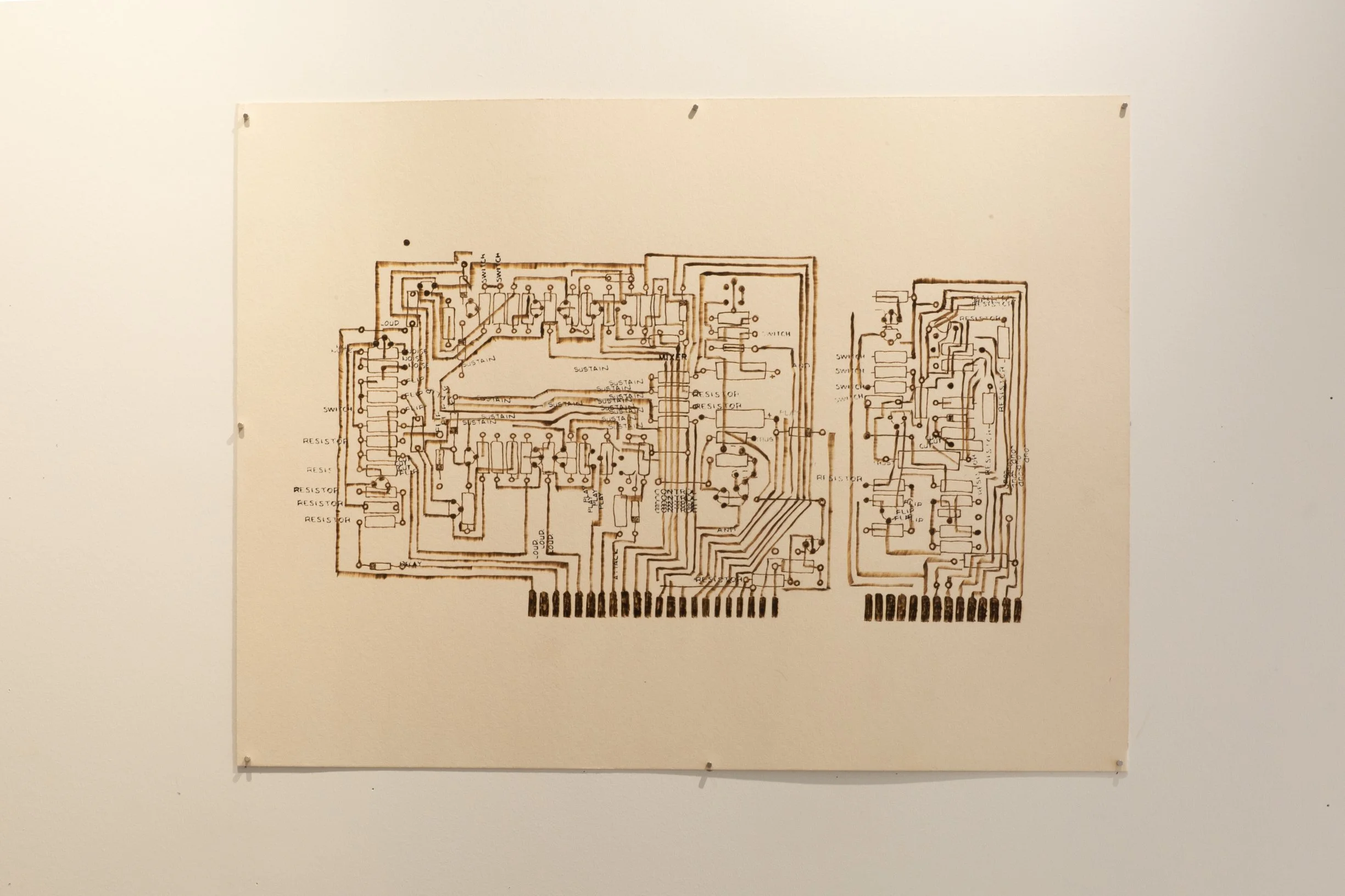 J Dilla’s Minimoog Voyager synthesizer | 37” x 28” - ink, taskboard, graphite, soldering iron heat
