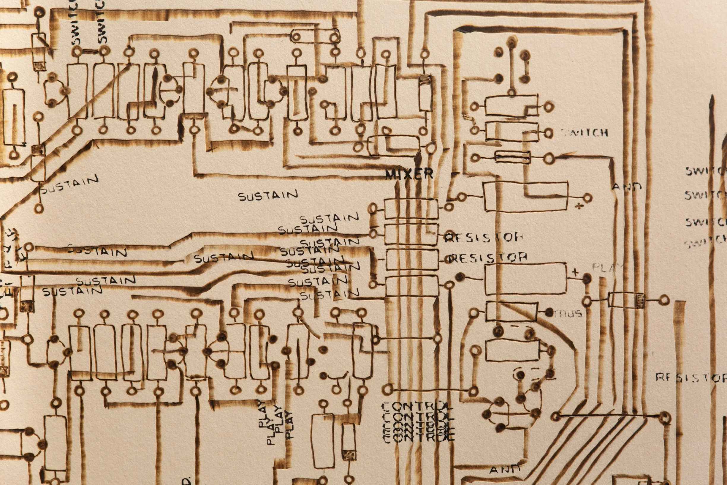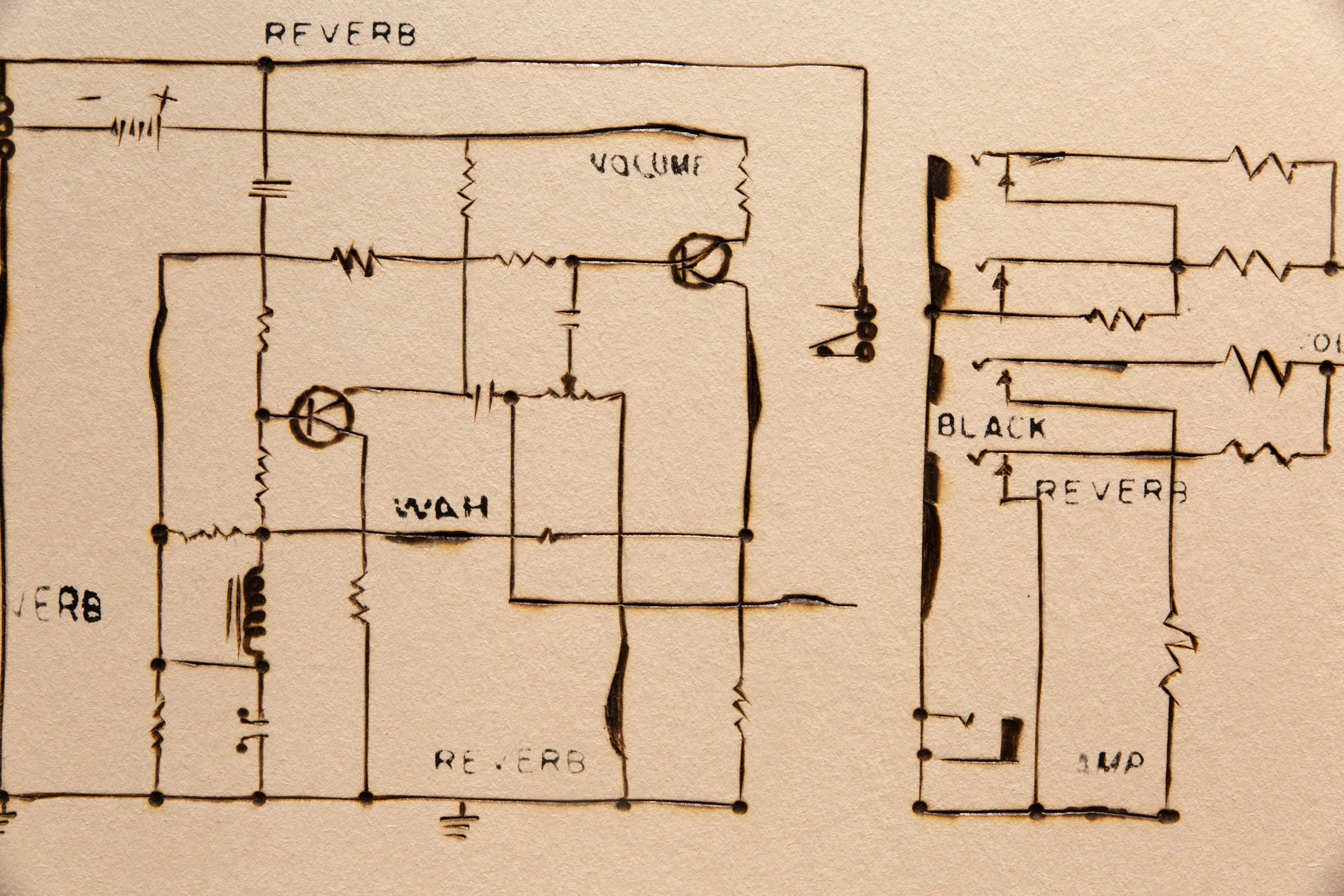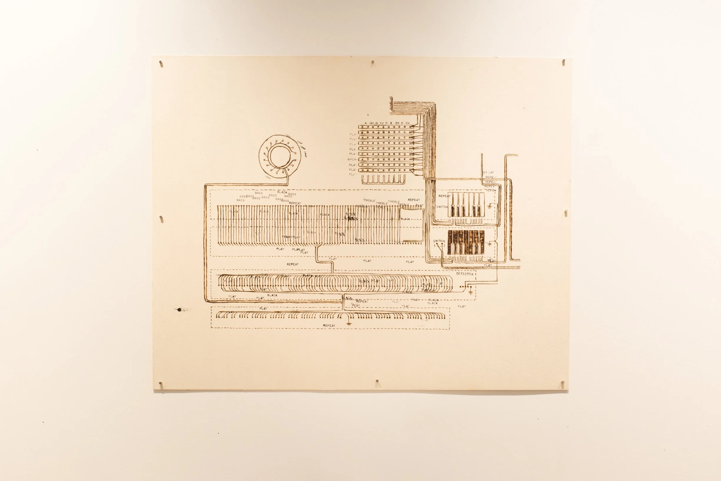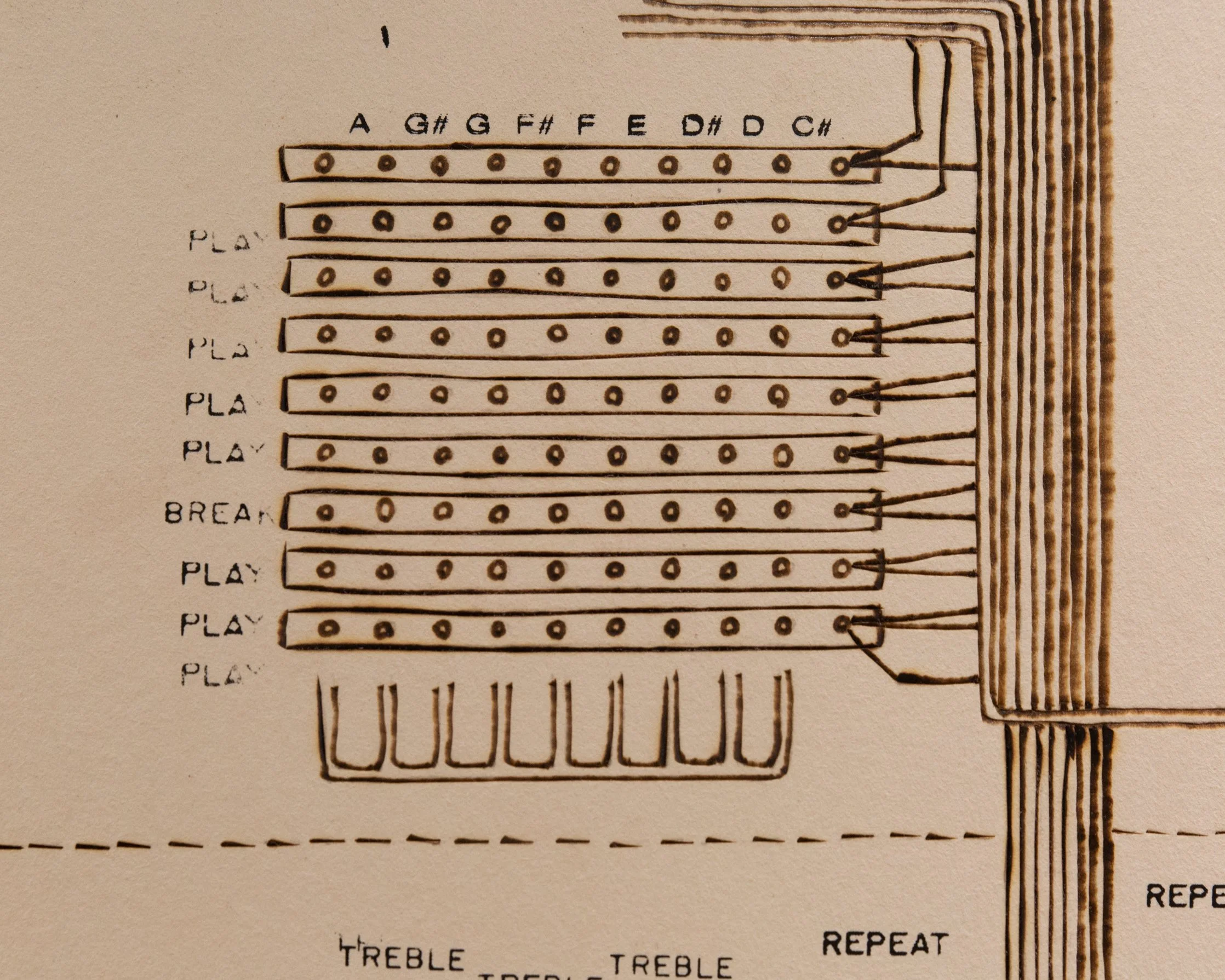 Jimmy Smith’s Hammond B-3 organ | 37.5” x 29.5” - ink, taskboard, graphite, soldering iron heat